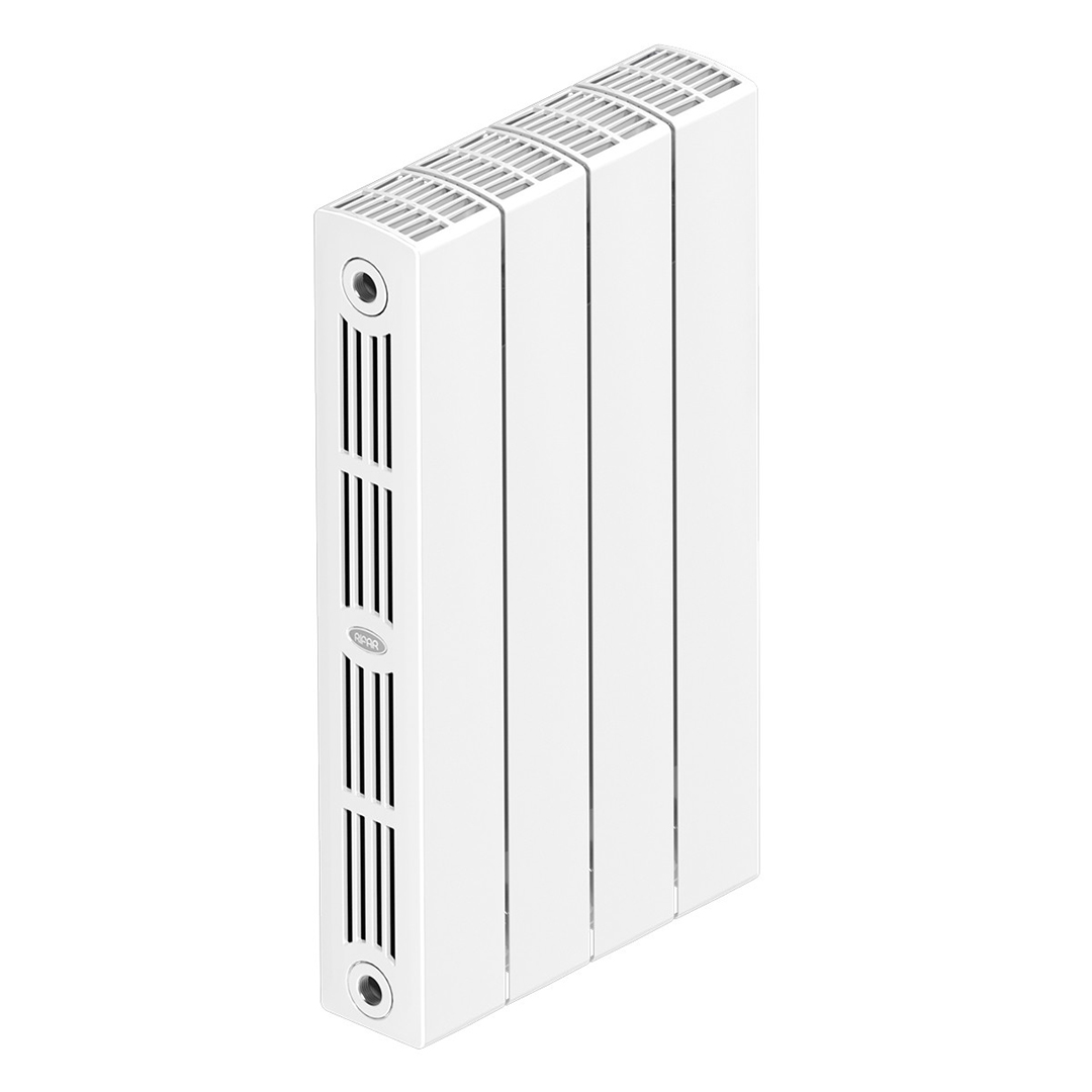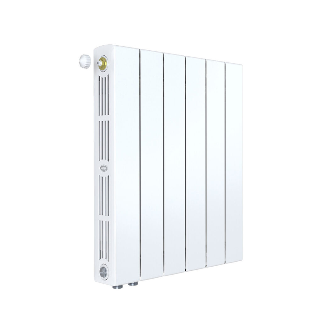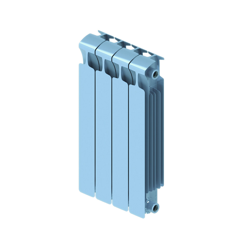 Вертикальный биметаллический радиатор: внутренняя часть секции прибора изготовлена из стали марки CORREX, а наружная – из алюминиевого сплава. Секции соединены по особой технологии «гидрозамка», при которой используют уплотнительное кольцо из эластичного этиленпропиленового каучука (EPDM) и ниппель специальной конструкции собственного производства. Оригинальный профиль коллектора и строго цилиндрическая поверхность ниппеля в месте соединения секций позволяют обеспечить классическое гидравлическое уплотнение для высоких (более 150 атм) нагрузок, при этом каучуковое кольцо не имеет контакта с алюминиевым сплавом. Всё это делает прибор очень прочным.