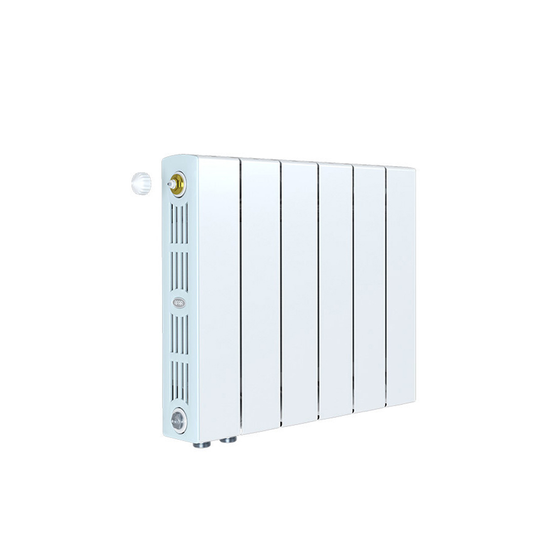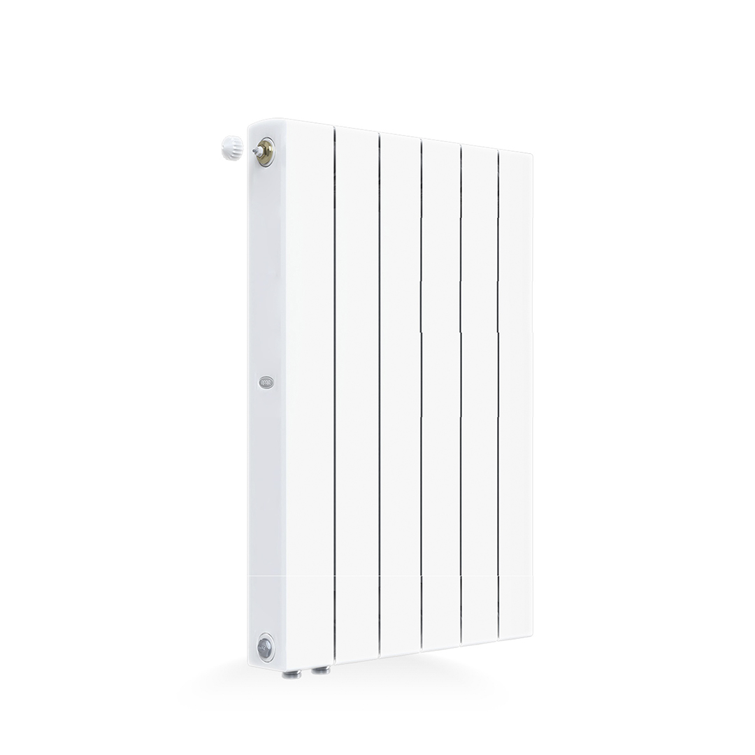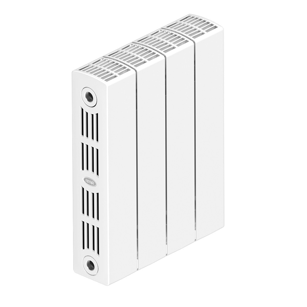 Вертикальный биметаллический радиатор: внутренняя часть секции прибора изготовлена из стали марки CORREX, а наружная – из алюминиевого сплава. Секции соединены по особой технологии «гидрозамка», при которой используют уплотнительное кольцо из эластичного этиленпропиленового каучука (EPDM) и ниппель специальной конструкции собственного производства. Оригинальный профиль коллектора и строго цилиндрическая поверхность ниппеля в месте соединения секций позволяют обеспечить классическое гидравлическое уплотнение для высоких (более 150 атм) нагрузок, при этом каучуковое кольцо не имеет контакта с алюминиевым сплавом. Всё это делает прибор очень прочным.